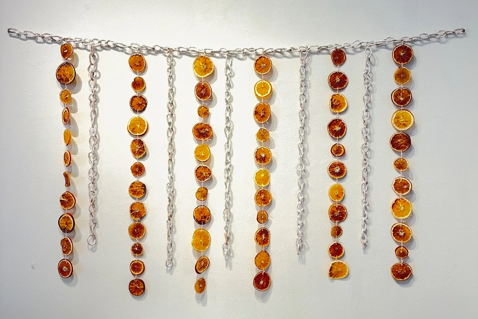 ‘Family Chain’ was my attempt to display physically the ancestry research I did several years ago when I first began to explore my Slovakian heritage. I had not many expectations going into my research, but to my surprise was able to trace back several generations of our family in Eastern Slovakia. I put together ceramic chains stained with Mayco Stain, but struggled with how to incorporate the names I’d found. I settled with dried orange slices, slightly crisped, wanting to take advantage of their sweet smell. I wrote the names on the slices to be viewable only when looking close-up. My ideal display of this work would be in front of a window, so as to make the slices act almost like stained glass.