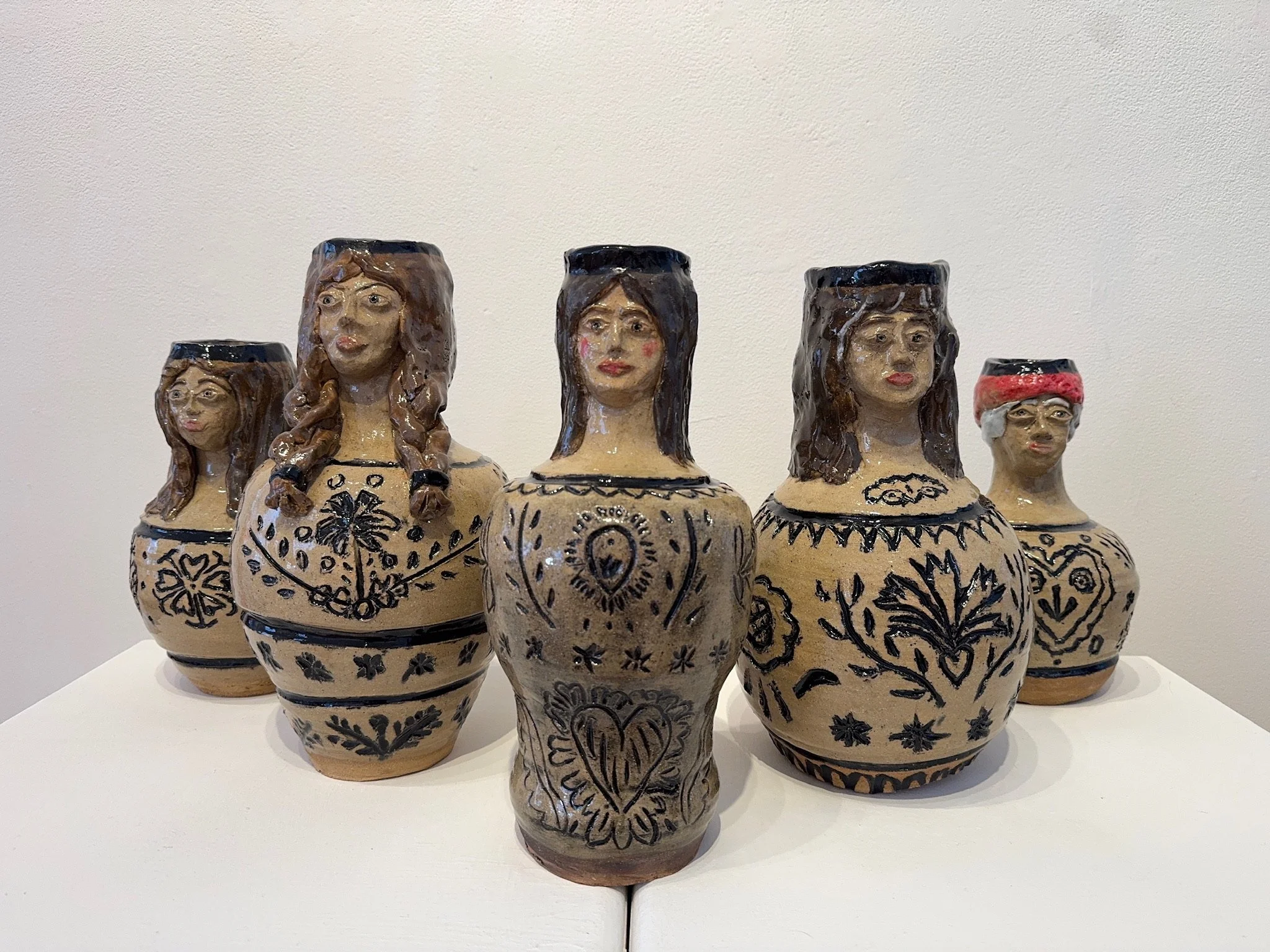 ‘Peasantries’ is a series of five thrown and coil-sculpted works I made to reflect the five phases of life for women. I specifically tried to imagine what my Slovakian ancestors would have looked like. The carvings on the vases are modernized versions of traditional majolka. A lot of my art historical research examines how women are considered ‘perfect vessels’. I wanted to challenge that image in transforming it. Here are the strong women I inherited my genes from - the space they hold is not empty, but made for a purpose.