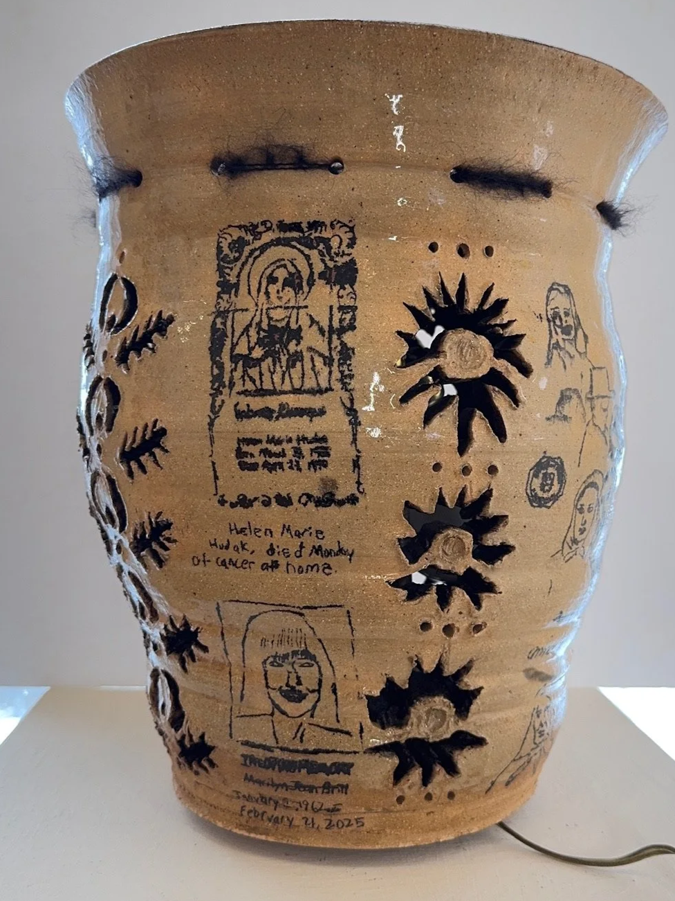 I cut folk designs into the vase, and latticed yarn given to my by my aunt on the top of it, with dried flowers from her funeral inserted. I installed a bulb inside - a light to shine on what previously went obscured.