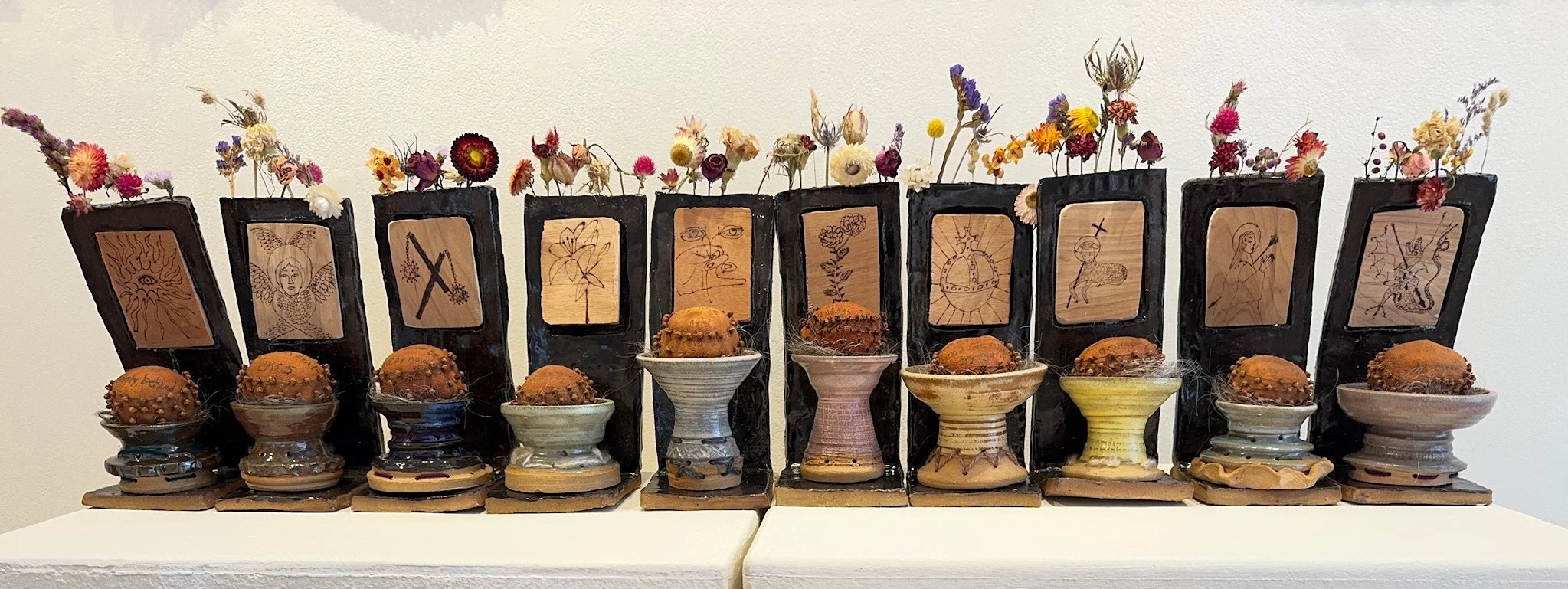 In ‘Reliquaries’ I wanted to examine how the personal can almost become holy, transformed in its memorialization. I created pomander oranges that I then tattooed with mantras that have followed me throughout my adult life. I then threw stands for them with holes that I then laced through with with yarn from my aunt. I hand-built larger ceramics niches for the stands with wood inserts cut from cigar boxes that I woodburned various religious images into. I collected natural materials over the course of the year to insert into the top of the niches, and placed the pomander oranges on their stands on beds of my mother’s hair.
