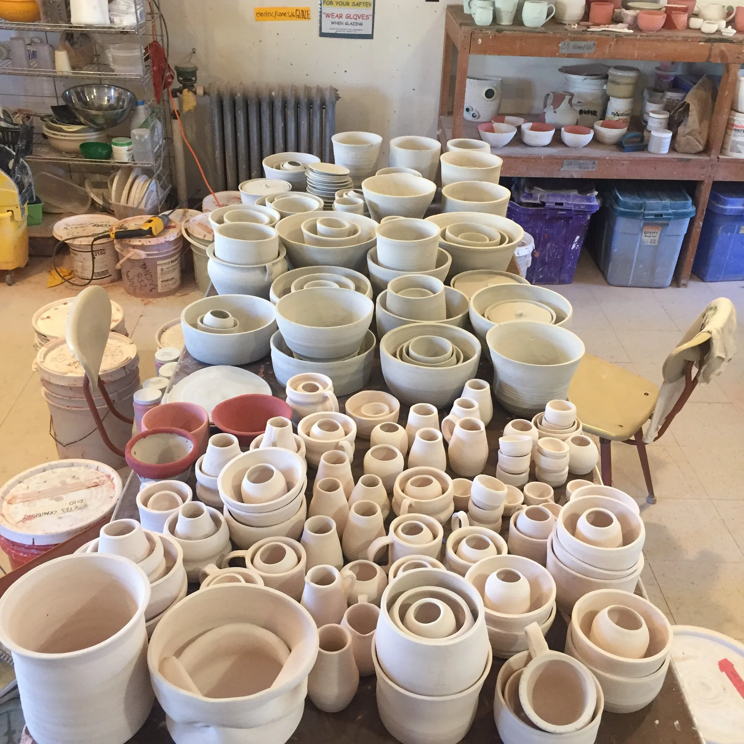 This was my Winter Term project for my first year at Oberlin College. I had joined the Pottery Co-Op and was interested in being able to fully become a production potter for the first time, aided with the promise of free clay, glaze and firing. I aimed to make a series of functional work that ultimately weighed more than my body weight, to make me and my work more than the sum of my parts; Iād then give away all these pieces to friends and donate the rest to our annual fundraiser. I ended up making more than my original goal, surpassing it even with the weight of my overall bisqueware. I learned a lot in the process, improving my endurance, throwing skills and in the end had a better understanding of my intentions as a potter.